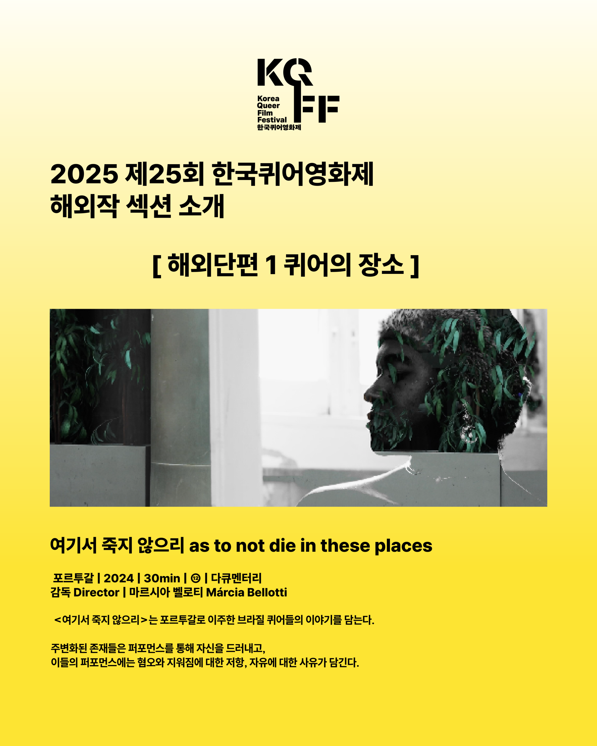 - ์ํ์๊ฐ: <์ฌ๊ธฐ์ ์ฃฝ์ง ์์ผ๋ฆฌ>๋ ํฌ๋ฅดํฌ๊ฐ๋ก ์ด์ฃผํ ๋ธ๋ผ์ง ํด์ด๋ค์ ์ด์ผ๊ธฐ๋ฅผ ๋ด๋๋ค. ์ฃผ๋ณํ๋ ์กด์ฌ๋ค์ ํผํฌ๋จผ์ค๋ฅผ ํตํด ์์ ์ ๋๋ฌ๋ด๊ณ , ์ด๋ค์ ํผํฌ๋จผ์ค์๋ ํ์ค์ ์ง์์ง์ ๋ํ ์ ํญ, ์์ ์ ๋ํ ์ฌ์ ๊ฐ ๋ด๊ธด๋ค.