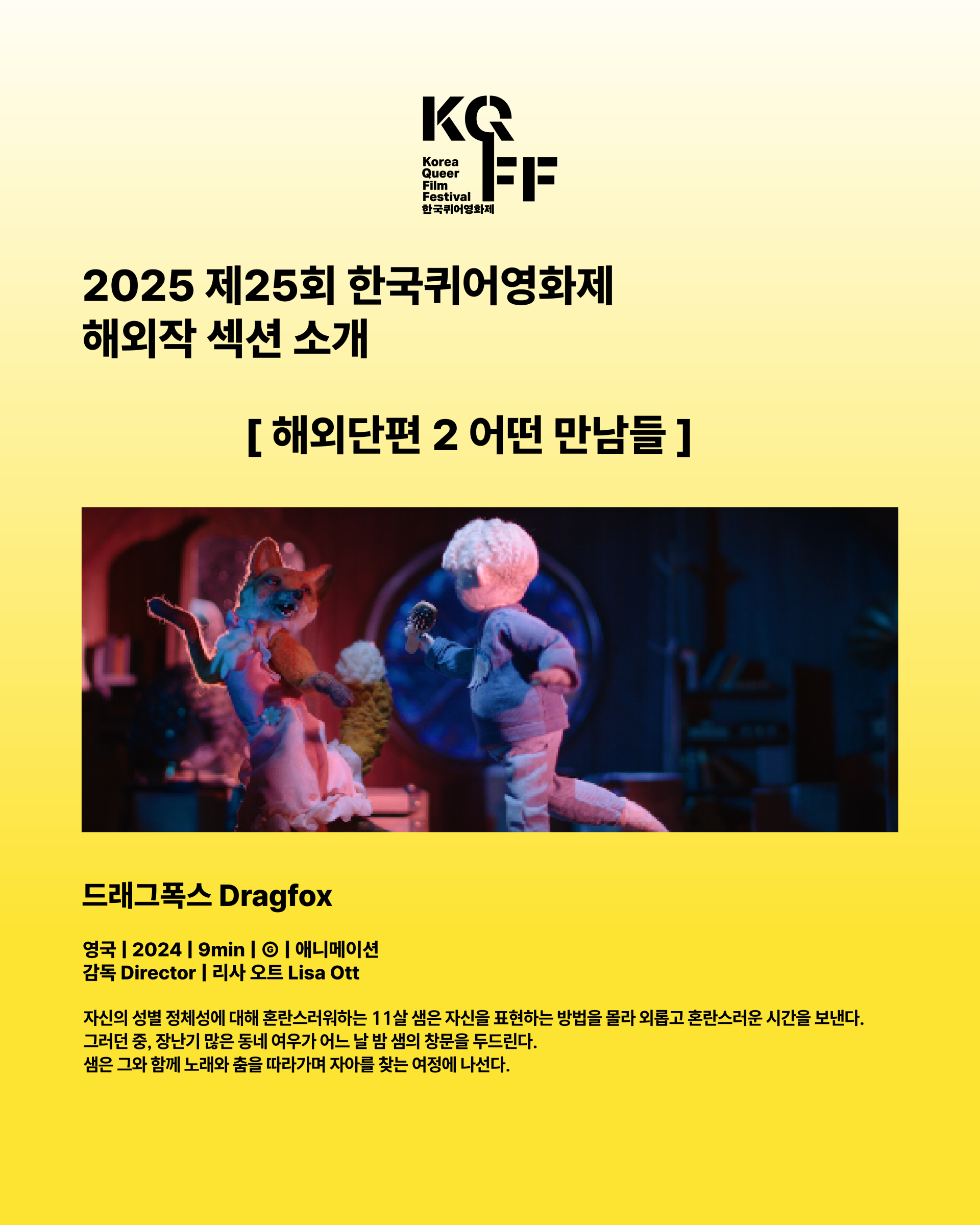 - ์ํ์๊ฐ: ์์ ์ ์ฑ๋ณ ์ ์ฒด์ฑ์ ๋ํด ํผ๋์ค๋ฌ์ํ๋ 11์ด ์์ ์์ ์ ํํํ๋ ๋ฐฉ๋ฒ์ ๋ชฐ๋ผ ์ธ๋กญ๊ณ ํผ๋์ค๋ฌ์ด ์๊ฐ์ ๋ณด๋ธ๋ค. ๊ทธ๋ฌ๋ ์ค, ์ฅ๋๊ธฐ ๋ง์ ๋๋ค ์ฌ์ฐ๊ฐ ์ด๋ ๋ ๋ฐค ์์ ์ฐฝ๋ฌธ์ ๋๋๋ฆฐ๋ค. ์์ ๊ทธ์ ํจ๊ป ๋ ธ๋์ ์ถค์ ๋ฐ๋ผ๊ฐ๋ฉฐ ์์๋ฅผ ์ฐพ๋ ์ฌ์ ์ ๋์ ๋ค.